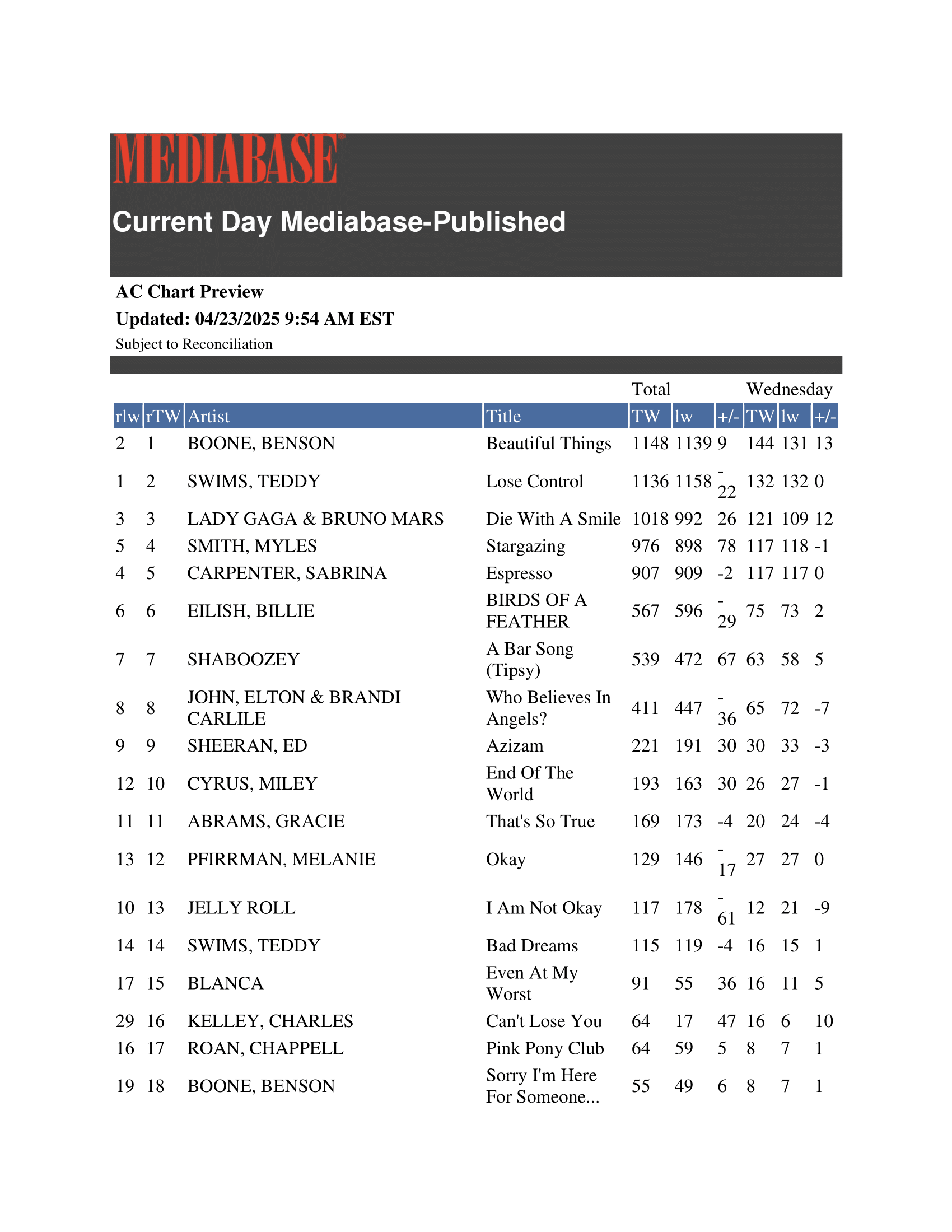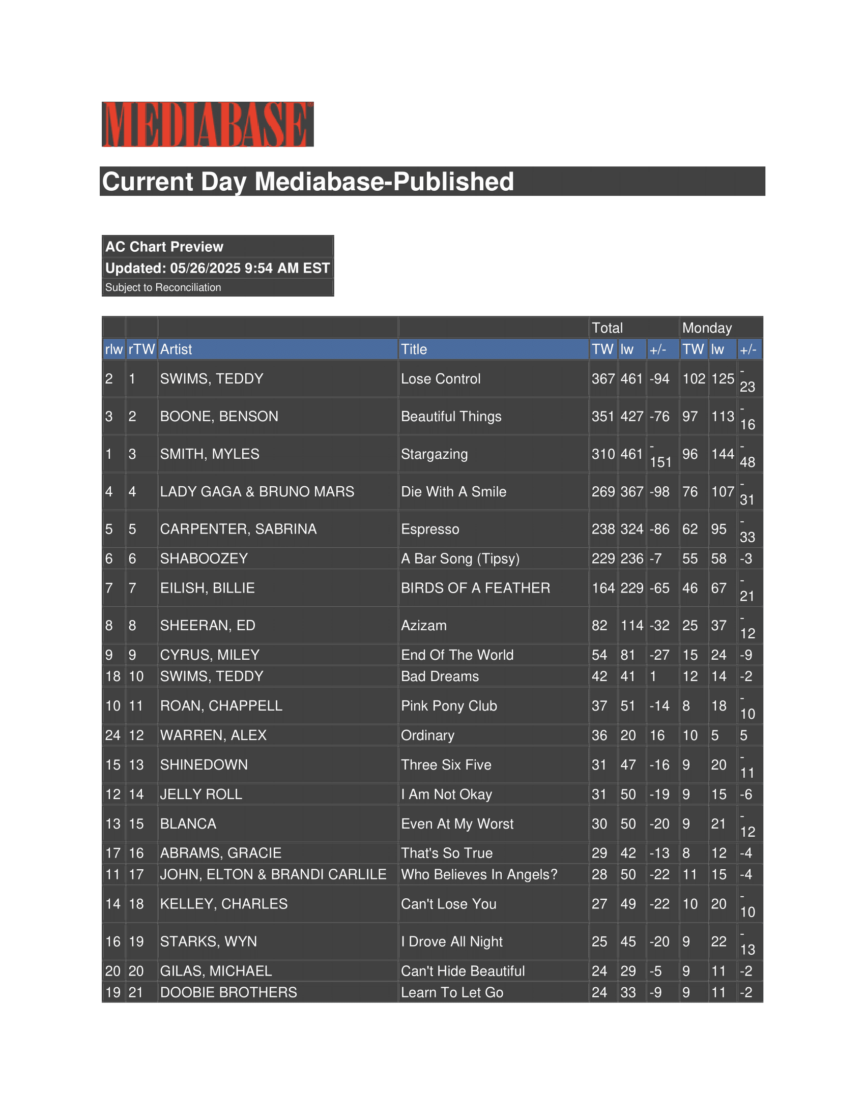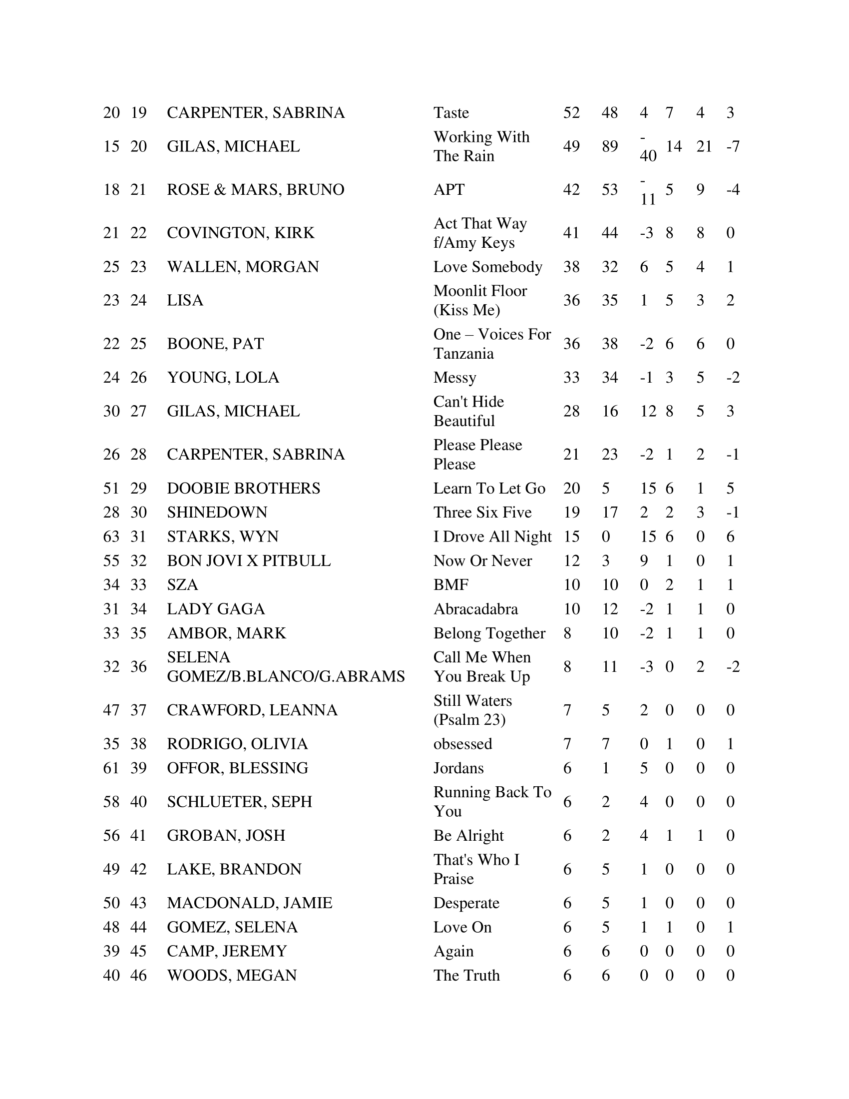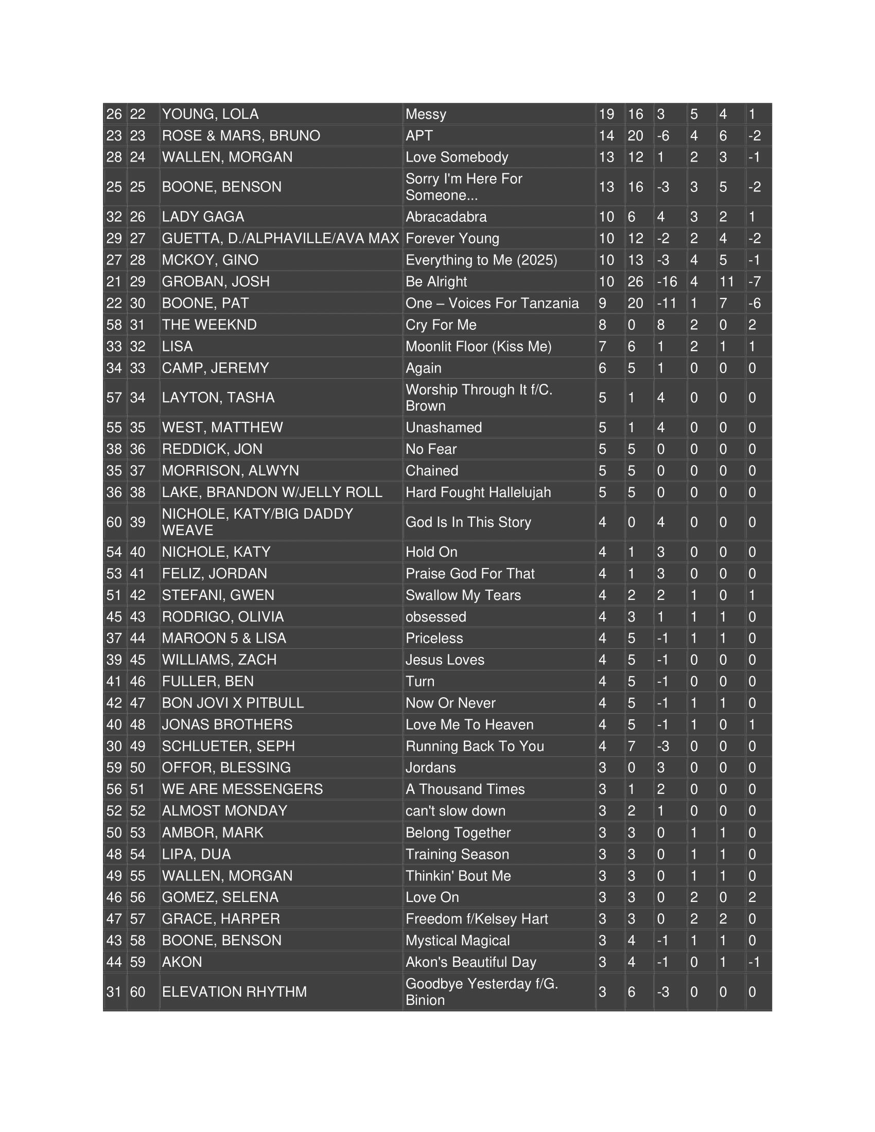| Can’t Hide Beautiful | — | Hot 100 #43, AC #17 | Top newly added pop radio track |